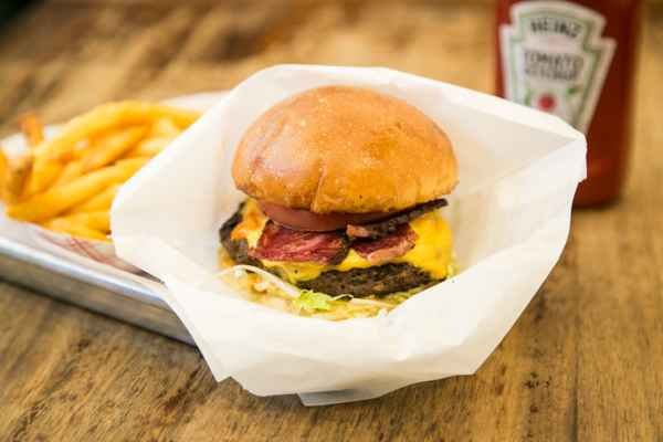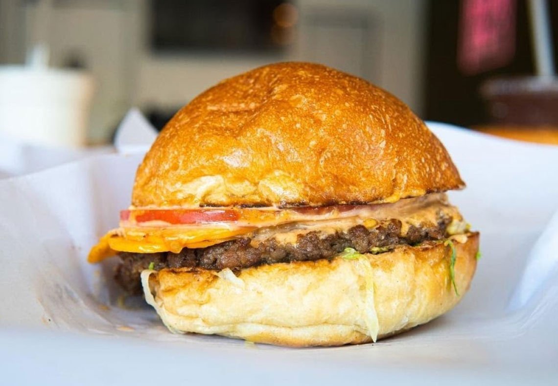 Chuck patty is topped with American cheese, holy sauce, lettuce, tomato, and onion.