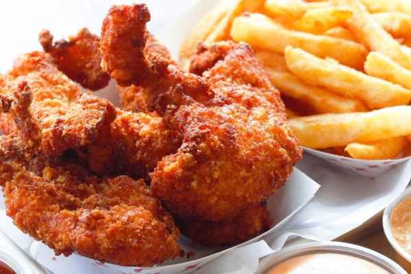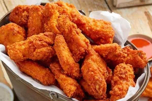 Chicken tenders are thin strips of juicy chicken coated in a crispy, deep fried breading and served hot.